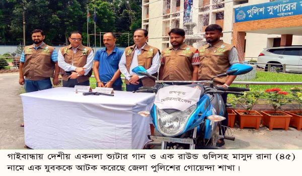 গাইবান্ধা প্রতিনিধি: গাইবান্ধা ডিবি পুলিশের একটি টিম গাইবান্ধা সদরে বিশেষ অভিযান চালিয়ে একটি দেশীয় এক নলা বিশিষ্ট ওয়ান সুটার গান ( অবৈধ দেশীয় বন্ধুক), ১ রাউন্ড কার্তুজ ও মোটরসাইকেলসহ মাসুদ রানা (৪০) নামে এক ব্যক্তিকে গ্রেফতার করেছে ৷ গ্রেফতারকৃত আসামী…