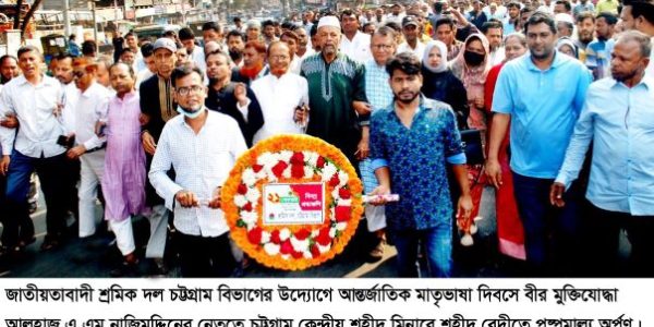 প্রেস বিজ্ঞপ্তি: বাংলাদেশ জাতীয়তাবাদী শ্রমিক দল চট্টগ্রাম বিভাগের উদ্যোগে শুক্রবার(২১ ফেব্রুয়ারি)সকালে আন্তর্জাতিক মাতৃভাষা দিবস মহান একুশে ফেব্রুয়ারি উদযাপন উপলক্ষে চট্টগ্রাম কেন্দ্রীয় শহীদ মিনারে শহীদ বেদীতে পুষ্পমাল্য অর্পণ করেন চট্টগ্রাম বিভাগীয় শ্রমিক দলের সভাপতি বীর মুক্তিযোদ্ধা আলহাজ্ব এএম নাজিম উদ্দিন ও…