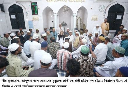 প্রেস বিজ্ঞপ্তি: চট্টগ্রাম বিভাগীয় শ্রমিক দলের দোয়া মাহফিল বিএনপির ভাইচ চেয়ারম্যান সাবেক মন্ত্রী জাতীয়তাবাদী শ্রমিক দলের কেন্দ্রীয় সাবেক সভাপতি, বীর মুক্তিযোদ্ধা আব্দুল্লাহ আল নোমানের মৃত্যুতে জাতীয়তাবাদী শ্রমিক দল চট্টগ্রাম বিভাগের পক্ষ থেকে তাৎক্ষণিক বাদে আছর নাসিমন ভবনস্থ দলীয় কার্যালয়ের মসজিদে…