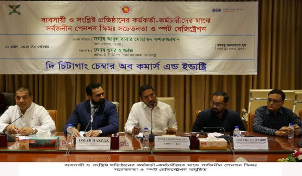 নগর প্রতিবেদক: ব্যবসায়ী ও সংশ্লিষ্ট প্রতিষ্ঠানের কর্মকর্তা-কর্মচারীদের মাঝে সর্বজনীন পেনশন স্কিমঃ সচেতনতা ও স্পট রেজিস্ট্রেশন অনুষ্ঠান আজ সোমবার (২২ এপ্রিল) সকালে ওয়ার্ল্ড ট্রেড সেন্টারস্থ বঙ্গবন্ধু কনফারেন্স হলে অনুষ্ঠিত হয়। চেম্বার সভাপতি ওমর হাজ্জাজ এর সভাপতিত্বে প্রধান অতিথি চট্টগ্রাম জেলা প্রশাসক…