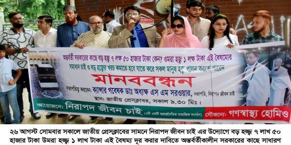 ঢাকা ব্যুরো: “নিরাপদ জীবন চাই” এর উদ্যোগে আজ সোমবার (২৬ আগষ্ট) সকালে জাতীয় প্রেসক্লাবের সামনে বড় হজ্জ্ব ৭ লাখ ৫০ হাজার টাকা উমরা হজ্জ্ব ১ লাখ টাকা এই বৈষম্য দূর করার দাবিতে অন্তর্বর্তীকালীন সরকারের কাছে সাধারণ মানুষ যাতে করে হজ্জ্ব…