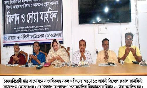 প্রেস বিজ্ঞপ্তি: বৈষম্যবিরোধী ছাত্র আন্দোলনে সাংবাদিকসহ সকল শহীদদের স্মরণে আজ মঙ্গলবার (১৩ আগস্ট) বিকেলে রুর্যাল জার্নালিস্ট ফাউন্ডেশন (আরজেএফ) এর উদ্যোগে বাংলাদেশ প্রেস কাউন্সিল মিলনায়তনে মিলাদ, দোয়া ও আলোচনা সভা অনুষ্ঠিত হয়। আরজেএফ চেয়ারম্যান এস এম জহিরুল ইসলামের সভাপতিত্বে ও মহাসচিব…
