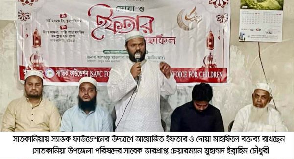 আজ বৃহস্পতিবার (১৯মার্চ) বিকালে জেলার সাতকানিয়া উপজেলার কাঞ্চনা ইউনিয়নের উত্তর কাঞ্চনা শান্তিপাড়া এলাকাবাসীর সাথে সাউথ এশিয়ান ভয়েস ফর চিল্ড্রেন (স্যাভক ফাউন্ডেশন) এর আয়োজনে গুনীজন ও গণ্যমান্য ব্যক্তিবর্গদের সম্মানে ইফতার ও দোয়া মাহফিলে প্রধান অতিথির বক্তব্যে সাতকানিয়া উপজেলা পরিষদের সাবেক ভারপ্রাপ্ত চেয়ারম্যান মুহাম্মদ ইব্রাহিম চৌধুরী এসব কথা বলেন।