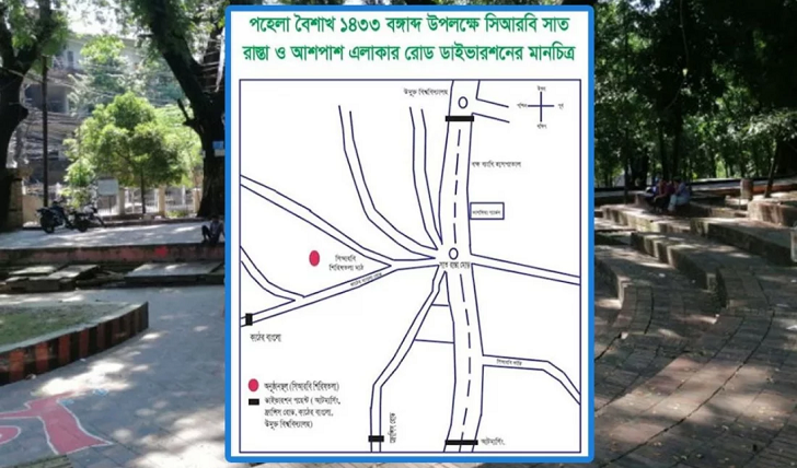 মহানগর পুলিশের পক্ষ থেকে জানানো হয়েছে, বৈশাখের সাংস্কৃতিক অনুষ্ঠান নির্বিঘ্ন করতে নজরুল স্কয়ার (ডিসি হিল) ও সিআরবি শিরিষতলা কেন্দ্রিক বিভিন্ন সড়কে রোড ব্লক বসিয়ে ডাইভারশন দেওয়া হবে।