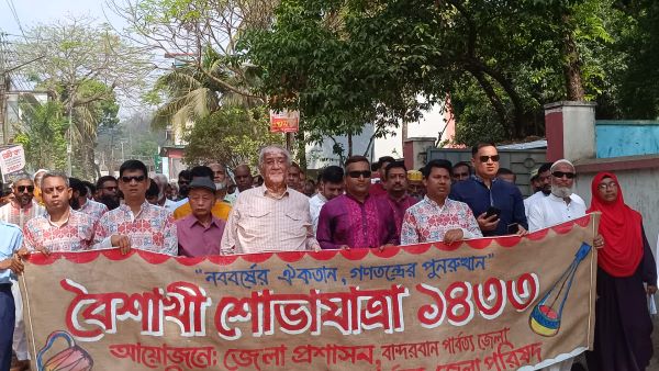 উদ্ধোধনের পর জেলা প্রশাসন ও পার্বত্য জেলা পরিষদের উদ্যোগে পহেলা বৈশাখের বর্নাঢ্য শোভাযাত্রা বের করা হয়। শোভাযাত্রায় বাঙালির ঐতিহ্য পালকি, ঘোড়ার গাড়ি নিয়ে বাঙালি নারী পুরুষেরা বিভিন্ন সাজসজ্জা এবং পাহাড়ের এগারোটি নৃজনগোষ্ঠীদের নারী-পুরুষেররা নিজস্ব ঐতিহ্য সংস্কৃতির পোষাক সাজসজ্জায় অংশ নেয়। শোভাযাত্রাটি শহরের গুরুত্বপূর্ণ সড়কগুলো প্রদক্ষিণ করে ক্ষুদ্র নৃগোষ্ঠী সাংস্কৃতিক ইনস্টিটিউটে গিয়ে শেষ হয়।