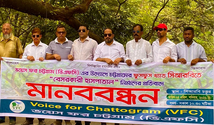 দি ক্রাইম ডেস্ক: চট্টগ্রামের ঐতিহ্যবাহী সিআরবি এলাকায় বেসরকারি হাসপাতালসহ সকল প্রকার স্থাপনা নির্মাণের উদ্যোগের প্রতিবাদে মানববন্ধন অনুষ্ঠিত হয়েছে। “ভয়েস ফর চট্টগ্রাম (ভিএফসি)” এর উদ্যোগে আয়োজিত এ কর্মসূচিতে নগরীর সর্বস্তরের মানুষ অংশগ্রহণ করেন।