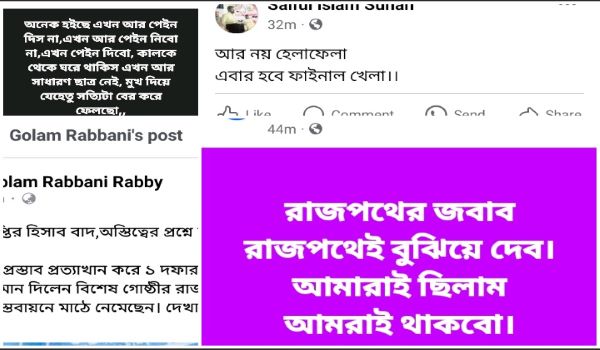 শনিবার রাতে একে একে নেতাকর্মীরা আন্দোলন প্রতিরোধের ইঙ্গিত দিয়ে পোস্ট দিয়েছেন। তার মধ্যে উল্লেখযোগ্য কিছু পোস্ট পাঠকদের জন্য তুলে ধরা হলো-