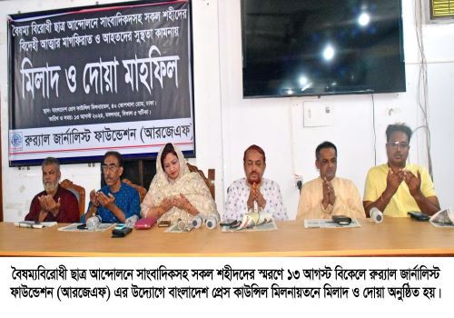 প্রেস বিজ্ঞপ্তি: বৈষম্যবিরোধী ছাত্র আন্দোলনে সাংবাদিকসহ সকল শহীদদের স্মরণে আজ মঙ্গলবার (১৩ আগস্ট) বিকেলে রুর্যাল জার্নালিস্ট ফাউন্ডেশন (আরজেএফ) এর উদ্যোগে বাংলাদেশ প্রেস কাউন্সিল মিলনায়তনে মিলাদ, দোয়া ও আলোচনা সভা অনুষ্ঠিত হয়।