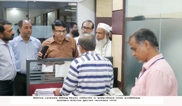 তিনি চেম্বারের সেক্রেটারীয়েট, ডেসপাচ, হিসাব শাখা, মেম্বারশীপ সেকশন ও ইঞ্জিনিয়ারিং সেকশন পরিদর্শন করেন। তিনি মেম্বারশীপ সেকশনে মেম্বারশীপ হালনাগাদ এবং নতুন মেম্বারশীপ প্রদানের ক্ষেত্রে সতর্কতা অবলম্বন করার জন্য প্রয়োজনীয় নির্দেশ প্রদান করেন। একই সাথে তিনি মেম্বারশীপ নিয়ে যাতে কোন ধরণের বিতর্ক সৃষ্টি না হয় সেজন্য সকলকে নৈতিকতা ও দায়িত্বশীলতার সাথে কাজ করার আহবান জানান। পরে তিনি চেম্বার সেক্রেটারীয়েটের কর্মকর্তাদের বিভিন্ন দিক নির্দেশনা প্রদান করেন।