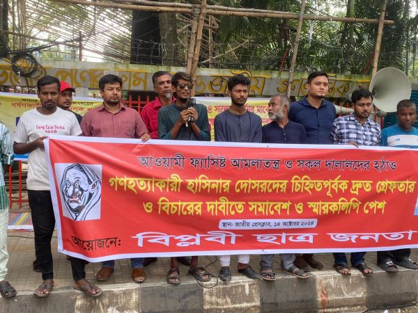 ঢাকা ব্যুরো: গণহত্যাকারী ফ্যাসিস্ট হাসিনার দোসর আমলা, গোবিন্দবর সহ চিহ্নিত সকল দালালদের বিচারের দাবিতে সোমবার (১৪ অক্টোবর) দুপুর ১২ টায় জাতীয় প্রেসক্লাবের সামনে সমাবেশ করেছে বিপ্লবী ছাত্র-জনতা। বিক্ষোভ মিছিল শেষে ডাক, টেলিযোগাযোগ ও তথ্যপ্রযুক্তি মন্ত্রণালয়ের উপদেষ্টা নাহিদ ইসলাম ও মন্ত্রী পরিষদ বিভাগের সচিব বরাবরে দাবি সম্বলিত স্মারকলিপি পেশ করা হয়।