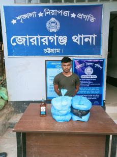 মিরসরাই প্রতিনিধিঃ মিরসরাই উপজেলার জোরারগঞ্জ থানাধীন বারইয়ারহাট পৌরসভায় অভিযান চালিয়ে ৬ কেজি গাঁজা এবং এক বোতল বিদেশি মদ সহ একজনকে গ্রেফতার করেছে পুলিশ। আজ মঙ্গলবার (০৫ নভেম্বর) সকাল সাড়ে ৯টায় জোরারগঞ্জ থানা পুলিশ অভিযান পরিচালনা করে বারইয়ারহাট পৌরসভাস্থ ৪নং ওয়ার্ডের কাশবন হোটেলের সামনে থেকে মোঃ ইকবাল হোসেনকে আটক করে।