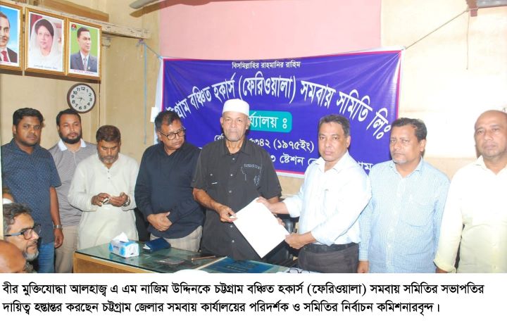 প্রেস বিজ্ঞপ্তি: বুধবার (০৬ নভেম্বর) সন্ধ্যায় ৭টার সময় স্টেশন রোডস্থ বন্দর বিতান মার্কেটে সংগঠন কার্যালয়ে চট্টগ্রাম বঞ্চিত হকার্স (ফেরিওয়ালা) সমবায় সমিতি লিঃ এর নবনির্বাচিত কমিটির দায়িত্ব হস্তান্তর করা হয়। কমিটির দায়িত্ব হস্তান্তর করেন নির্বাচন কমিশনার চট্টগ্রাম জেলার সমবায় কর্মকর্তা জেলা সমবায় পরিদর্শক শাহ এরফানুল হক। পবিত্র কোরআন তেলাওয়াতের মাধ্যমে নবনির্বাচিত সভাপতি আলহাজ্ব এম নাজিম উদ্দিন এর সভাপতিত্বে সভা অনুষ্ঠিত হয়।