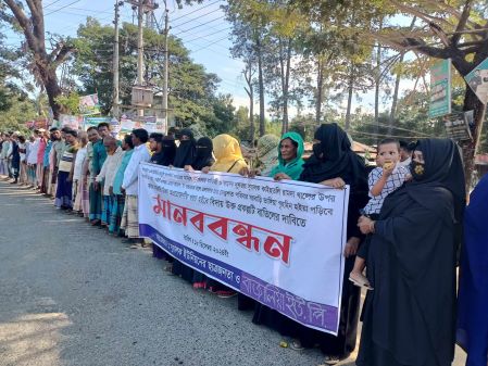 সুকান্ত বিকাশ ধর, সাতকানিয়া: পার্বত্য জেলা বান্দরবানের সুয়ালক ইউনিয়নের কাইচতলী এলাকার রামদা খালের উপর রাবার ড্যাম (স্লুইসগেট) নির্মাণ প্রকল্প গ্রহণ করে সাতকানিয়া উপজেলার হাজার হাজার একর কৃষিজমি অনাবাদি রাখার অপচেষ্টার প্রতিবাদে মানববন্ধন অনুষ্ঠিত হয়েছে। আজ বুধবার (১৮ ডিসেম্বর) সকালে সাতকানিয়া উপজেলার হলুদিয়া বাজারে বাজালিয়া ইউনিয়ন ও বান্দরবানের সুয়ালক ইউনিয়নের কাইচতলী গ্রামের প্রায় ৫ শতাধিক কৃষক ব্যানার ও প্লেকার্ড বহন করে এ মানববন্ধনে অংশ নেন।