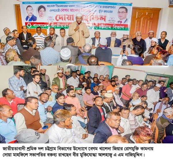 প্রেস বিজ্ঞপ্তি: বাংলাদেশ জাতীয়তাবাদী শ্রমিক দল চট্টগ্রাম বিভাগের উদ্যোগে আজ রবিবার (১২ জানুয়ারি)বিকালে বিএনপি চেয়ারপারসন সাবেক প্রধানমন্ত্রী দেশনেত্রী বেগম খালেদা জিয়ার রোগ মুক্তি কামনায় এক দোয়া মাহফিল নাসিমন ভবন দলীয় কার্যালয়ে বিএনপির কেন্দ্রীয় শ্রমিক সম্পাদক ও চট্টগ্রাম বিভাগে শ্রমের সভাপতি আলহাজ্ব এ এম নাজিমুদ্দিনের সভাপতিত্বে কাজী শেখ নুরুল্লাহ বাহারের সঞ্চালনায় অনুষ্ঠিত হয়।