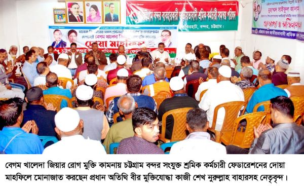 প্রেস বিজ্ঞপ্তি: শ্রমিক কর্মচারী ফেডারেশনের দোয়া ও মিলাদ মাহফিল চট্টগ্রাম বন্দর সংযুক্ত শ্রমিক কর্মচারী ফেডারেশনের উদ্যোগে আজ বৃহস্পতিবার (১৬ জানুয়ারি)বিকালে বিএনপির চেয়ারপারসন সাবেক প্রধানমন্ত্রী বেগম খালেদা জিয়ার রোগ মুক্তি কামনায় দোয়া ও মিলাদ মাহফিল অনুষ্ঠিত হয়। দোয়া মাহফিলে প্রধান অতিথি হিসেবে উপস্থিত ছিলেন চট্টগ্রাম বিভাগীয় শ্রমিক দলের সাধারণ সম্পাদক বীর মুক্তিযোদ্ধা কাজী শেখ নুরুল্লাহ বাহার। সভাপতিত্ব করেন সংযুক্ত শ্রমিক ফেডারেশনের সভাপতি মোহাম্মদ হারুন।