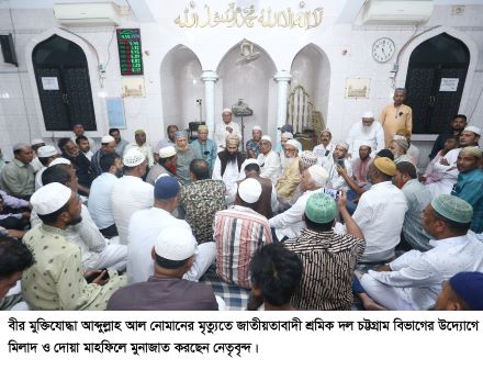 প্রেস বিজ্ঞপ্তি: চট্টগ্রাম বিভাগীয় শ্রমিক দলের দোয়া মাহফিল বিএনপির ভাইচ চেয়ারম্যান সাবেক মন্ত্রী জাতীয়তাবাদী শ্রমিক দলের কেন্দ্রীয় সাবেক সভাপতি, বীর মুক্তিযোদ্ধা আব্দুল্লাহ আল নোমানের মৃত্যুতে জাতীয়তাবাদী শ্রমিক দল চট্টগ্রাম বিভাগের পক্ষ থেকে তাৎক্ষণিক বাদে আছর নাসিমন ভবনস্থ দলীয় কার্যালয়ের মসজিদে দোয়া ও মিলাদ মাহফিল অনুষ্ঠিত হয়।