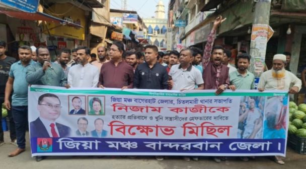 বশির আহমেদ, বান্দরবান জেলা প্রতিনিধি : বান্দরবানে জিয়া মঞ্চ জেলা শাখার সদস্যরা আজ মঙ্গলবার(১৮ মার্চ) চিতলমারী থানার সভাপতি নিজাম কাজীকে নির্মমভাবে হত্যা করার প্রতিবাদে একটি বিক্ষোভ মিছিল করেছে। মিছিলে অংশগ্রহণকারীরা দ্রুত অপরাধীদের গ্রেফতারের দাবি জানিয়ে শান্তিপূর্ণভাবে প্রতিবাদ জানান।