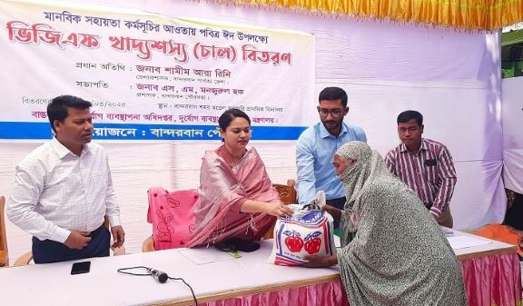 জেলা প্রশাসক শামীম আরা রিনি ভিজিএফ খাদ্যশস্য বিতরণ কর্মসূচির উদ্বোধন করেন এবং গরিব ও অসহায়দের মানবিক সহায়তা কর্মসূচির আওতায় পবিত্র ঈদুল ফিতর উপলক্ষ্যে ভিজিএফ খাদ্যশস্য হিসেবে প্রতিজনকে ১০ কেজি করে চাল বিতরণ করেন।