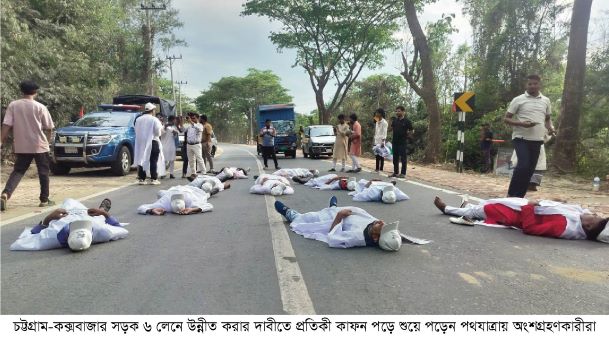 নিজস্ব প্রতিনিধি : চট্টগ্রাম-কক্সবাজার মহাসড়ক ৬ লেন করার দাবিতে প্রতিকী কাফন পরে পদযাত্রা ও গণসাক্ষর কর্মসূচি পালন করলেন ১১ ব্যক্তি। গত ৯ এপ্রিল সকালবেলা চট্টগ্রাম নগর থেকে এ পদযাত্রা শুরু করা হয়। বেলা সাড়ে তিনটায় পৌঁছে লোহাগাড়া উপজেলার চুনতি ইউনিয়নের পাহাড়বেষ্টিত জাঙ্গাইল্যা সড়ক দূর্ঘটনাপ্রবণ এলাকায়। সড়কে অবস্থান নেয় পদযাত্রায় অশগ্রহণকারী ১১জন।