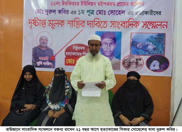 আজ শুক্রবার, (০২ মে) বিকালে রাউজান পৌরসভার মুন্সিরঘাটাস্থ একটি সম্মেলন কক্ষে এ সংবাদ সম্মেলন করা হয়। এতে লিখিত বক্তব্য পাঠ করেন হত্যাকাণ্ডের শিকার সোহেলের পিতা ও রাউজান উপজেলার উরকিরচর ইউনিয়নের মইশকরম গ্রামের বাসিন্দা নুরুল কবির।