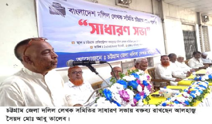 প্রেস বিজ্ঞপ্তি : বাংলাদেশ দলিল লেখক সমিতি চট্টগ্রাম জেলা শাখার সাধারণ সভা আজ শনিবার (১০ মে) সকালে কোর্ট রোডস্থ চট্টগ্রাম রেজিষ্ট্রেশন কমপ্লেক্স দলিল লেখক সমিতির ১নং মিলনায়তনে অনুষ্ঠিত হয়। এতে সভাপতিত্ব করেন চট্টগ্রাম জেলা দলিল লেখক সমিতির সভাপতি আলহাজ্ব মোঃ জসিম উদ্দিন।