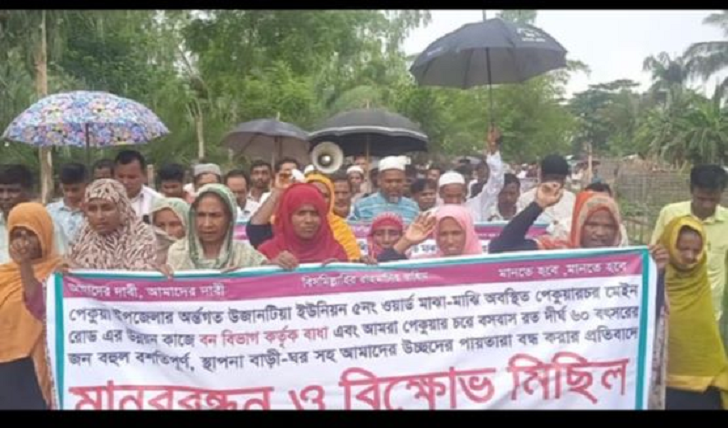 বক্তারা বলেন, উজানটিয়ার পেকুয়ার চরসহ ৫নং ওয়ার্ডের প্রাণের দাবি ছিল পেকুয়ার চর সড়ক পাকাকরণ কাজ সমাপ্ত করা। গেল ২০২৩-২৪ অর্থ বছরে সরকার পেকুয়ার চর সড়ক সংস্কারের কাজ আরম্ভ করে। এলজিইডি সড়কটি কার্পেটিং দ্বারা উন্নয়নের কাজ শুরু করে। ‘মেসার্স চকরিয়া ডেভলপমেন্ট’ নামের ঠিকাদারি প্রতিষ্ঠান নতুনঘোনার রুকুরগুদা থেকে পেকুয়ার চর হয়ে ষাটদুনিয়া পাড়া ফোরকানের দোকান পর্যন্ত দু’কিলোমিটার মেকাডমসহ সড়কে কংক্রিটের কাজ শেষ করেছে। বিটুমিনসহ পাকাকরণের কাজটি এখনো অর্ধ সমাপ্ত অবস্থায় রয়েছে। রাজনৈতিক পটপরিবর্তনের পর সম্প্রতি সড়কটি পিচ ঢালাইয়ের কাজে বাধা দেওয়া হচ্ছে। উপকূলীয় বনবিভাগ থেকে এ বাধা দিয়েছে। তাঁরা দাবী করছে এ রাস্তা তাদের মালিকানাধীন সম্পত্তির উপর নির্মিত হচ্ছে। গত কয়েক মাস ধরে বনবিভাগ স্থানীয়দের বাড়িঘর নির্মাণ ও সংস্কার কাজেও বাধা প্রদান করছে। অথচ পেকুয়ার চরে মানুষ বসবাস করছে প্রায় শত বছর আগে থেকে। ১৯৯৯ সালে সড়কটি প্রশস্থকরণ করা হয়েছে। প্রায় বিশ বছর সড়কে ইট বিছানো ছিল। হঠাৎ বনবিভাগের এমন হটকারি সিদ্ধান্তে আমরা বিস্মিত হয়েছি। সরকারি কর্তৃপক্ষ কাজ বাস্তবায়ন করছে। কিন্তু বনবিভাগ এত বছর পরে এসে উন্নয়নে বাধাগ্রস্ত করবে দেখে আমরা মর্মহত হয়েছি। এ সড়কটি উজানটিয়ার বিপুল জনগোষ্ঠীর অন্যতম যাতায়াত মাধ্যম। এর উন্নয়ন বাধাগ্রস্ত হলে নেতিবাচক প্রভাব পড়বে স্থানীয় পর্যায়ে। থেমে যাবে যোগাযোগ ব্যবস্থা।