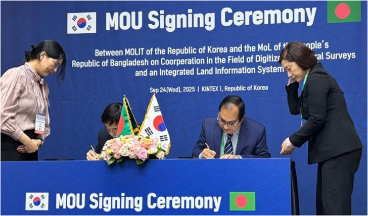 বুধবার (২৪ সেপ্টেম্বর) দক্ষিণ কোরিয়ায় আয়োজিত ২০২৫ কে-জিও ফেস্টে বাংলাদেশ সরকারের ভূমি মন্ত্রণালয়ের সিনিয়র সচিব এ এস এম সালেহ আহমদ এবং দক্ষিণ কোরিয়ার ভূমি, অবকাঠামো ও পরিবহন মন্ত্রণালয়ের উপমন্ত্রী মি. লি সাং কিয়ং এ সমঝোতা স্মারক স্বাক্ষর করেন।