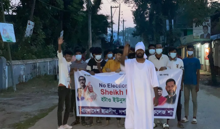 ভাইরাল হওয়া ভিডিওতে দেখা যায়, ব্যানারের সামনে কাফনের কাপড় পরে ও মিছিলে অংশগ্রহণকারী নিষিদ্ধ ঘোষিত সংগঠন ছাত্রলীগের নেতাকর্মীদের মাথায় কাফনের কাপড় বাধা ছিল।