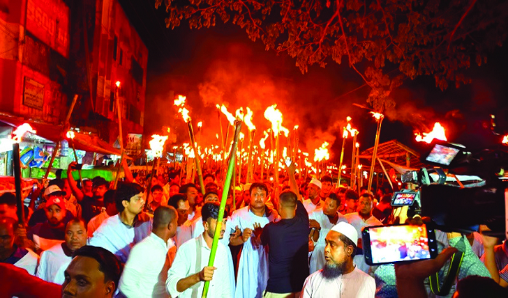 কক্সবাজার প্রতিনিধি: সড়কে কলাগাছ রোপণ ও টায়ার জ্বালিয়ে প্রতিবাদের পর এবার শরীরে কাফনের কাপড় পরে উখিয়া–টেকনাফ আসনে (কক্সবাজার–৪) বাংলাদেশ জাতীয়তাবাদী দলের (বিএনপির) মনোনয়ন পরিবর্তনের দাবিতে মশাল মিছিল করেছেন কক্সবাজার জেলা বিএনপির অর্থ সম্পাদক ও বিএনপির মনোনয়ন প্রত্যাশী মো. আব্দুল্লাহর সমর্থকরা। গতকাল রবিবার সন্ধ্যা সাড়ে ৭টার দিকে টেকনাফ শাপলা চত্বর থেকে শুরু করে ঝর্ণা চত্বর এলাকায় এসে শেষ হয় এ মিছিল। মিছিলে বিএনপির মনোনয়ন প্রার্থীকে ‘আওয়ামী আঁতাতকারী’ আখ্যা দিয়ে নানা রকম স্লোগান দেওয়া হয়।