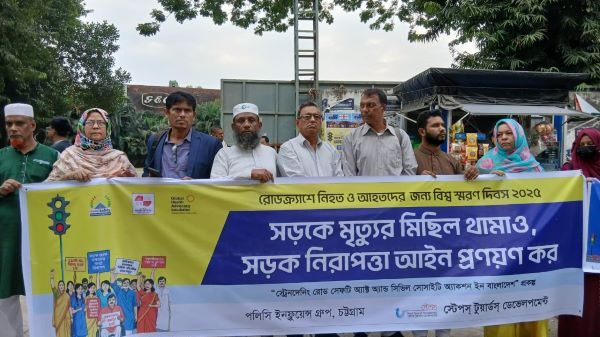 মুন্নি আক্তার,নগর প্রতিবেদক: চট্টগ্রামে রোড় ক্র্যাশে আহত ও নিহতদের জন্য বিশ্ব স্মরণ দিবস উদাপযন উপলক্ষে “সড়কে মৃত্যুর মিছিল থামাও, সড়ক নিরাপত্তা আইন প্রণয়নের দাবিতে” চট্টগ্রামে বেসরকারী উন্নয়ন সংগঠন স্টেপস টুয়ার্ডস ডেভেলপমেন্ট, পলিসি ইনফ্লুয়েন্স গ্রুপ-চট্টগ্রাম ও ক্যাব চট্টগ্রামের উদোগে আজ সোমবার (০২ ডিসেম্বর) বিকাল ৩.৪৫মিনিটে মানববন্ধন নগরীর জিইসি কনভেনশনের হলের সামনে অনুষ্টিত হয়। এতে সভাপতিত্ব করেন পলিসি ইনফ্লুয়েন্স গ্রুপ চট্টগ্রামের সভাপতি বিশিষ্ট কলামিস্ট মুম্মদ মুসা খান।
