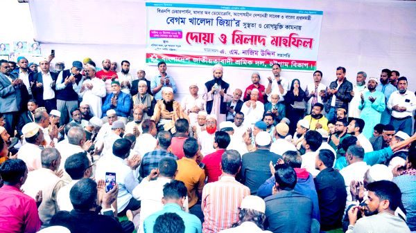 নাজিমুর রহমান বলেন, বেগম খালেদা জিয়া দেশ-বিদেশে তিনি যে ভালোবাসার অর্জন করেছেন সেটি বাংলাদেশে আর কোন নেতা নেত্রী এই খ্যাত অর্জন করতে পারেন নাই। তিনি শুধু এখন দলের নেত্রী নন, তিনি দলমত নির্বিশেষে সর্বজনীন ব্যক্তিত্বের অধিকারী, রাজনৈতিক অভিভাবক, গণতন্ত্রের মুক্তির পথিক। আল্লাহ যেন উনাকে আমাদের মাঝে আবার সুস্থ করে ফিরিয়ে দেন। আল্লাহর কাছে এই দোয়া কামনা করছি। পরিশেষে উপস্থিত অসংখ্য শ্রমিক জনতা মোনাজাত করে আল্লাহর কাছে কান্নাকাটি করে দোয়া করেন। আল্লাহ যেন বেগম খালেদা জিয়াকে সুস্থতা দান করেন। সকলের শুকরিয়া আদায় করে আল্লাহর দরবারে এ এম নাজিমুদ্দিনকে কঠিন রোগ থেকে উদ্ধার করে আমাদের মাঝে আজকে মোনাজাতে অংশ নেওয়ার সুযোগ করে দিয়েছেন। মহান স্বাধীনতার ঘোষক শহীদ রাষ্ট্রপতি জিয়াউর রহমান, আরাফাত রহমানের রুহের মাগফেরাত কামনা করে দেশ ও জাতির মঙ্গল কামনা করে আল্লাহর কাছে দোয়া করেন।