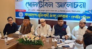 নগর প্রতিবেদক: বাংলাদেশ সুফিবাদী ঐক্য ফোরামের কেন্দ্রীয় পরিষদের উদ্যোগে ‘বর্তমান প্রেক্ষাপটে সুফিবাদীদের করণীয়’ শীর্ষক গোলটেবিল বৈঠক বুধবার ১০ ডিসেম্বর বিকেলে চট্টগ্রাম প্রেসক্লাবের সুলতান আহমদ হলে সম্পন্ন হয়েছে। ঐক্য ফোরামের চেয়ারম্যান সাংবাদিক নুর মোহাম্মদ রানার সভাপতিত্বে ও মহাসচিব মাস্টার মুহাম্মদ আবুল হোসাইনের সঞ্চালনায় গোলটেবিল আলোচনায় প্রধান অতিথি ছিলেন ঐতিহ্যবাহী মাইজভান্ডার দরবার শরিফের গাউছিয়া আহমাদিয়া মঞ্জিলের নায়েবে সাজ্জাদানশিন শাহসুফি সৈয়্যদ সাজ্জাদ হোসেন সোহেল আল মাইজভান্ডারী (মা:জি:আ:)।