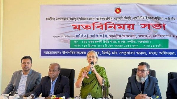 চকরিয়া প্রতিনিধি: চিংড়ির উৎপাদন বৃদ্ধির পাশাপাশি নিরাপদ ও গুণগত উৎপাদন নিশ্চিত করা অত্যন্ত জরুরি। আজ সোমবার(১৫ ডিসেম্বর) সকালে চকরিয়া উপজেলার বদরখালী ইউনিয়নের রামপুর মৌজায় অবস্থিত ৪৮ একর আয়তনের প্রদর্শনী চিংড়ি খামারে মৎস্য অধিদপ্তরাধীন সরকারি চিংড়ি এস্টেটের ইজারাগ্রহীতা ও চিংড়ি চাষীদের সাথে আয়োজিত মতবিনিময় সভায় প্রধান অতিথির বক্তব্যে মৎস্য ও প্রাণিসম্পদ উপদেষ্টা ফরিদা আখতার এসব কথা বলেন।