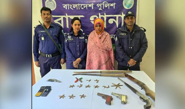 এসময় ঘর থেকে এক নারীকে আটক করা হয়। পরে তল্লাশি চালিয়ে বিশেষ কৌশলে লুকিয়ে রাখা অবস্থায় ২টি বিদেশি পিস্তল, ১টি দেশীয় তৈরি বন্দুক, বিভিন্ন ধরনের ৫৫টি গুলি, ৪টি খালি কার্তুজের খোসা, ১টি বন্দুকের বাট, ১টি খেলনার পিস্তল, ২টি লম্বা দা ও ১টি কাটার উদ্ধার করা হয়।