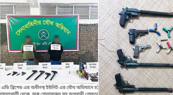 নগর প্রতিবেদক: বোয়ালখালী থানার বেঙ্গুরা এলাকায় সেনাবাহিনীর যৌথ অভিযানে ৪টি শট গান, ২টি পিস্তল (ম্যাগাজিন সহ), ১৩ রাউন্ড গোলাবারুদ এবং বিভিন্ন অস্ত্র তৈরীর সামগ্রী উদ্ধার সহ দুই শীর্ষ সন্ত্রাসীকে গ্রেফতার করা হয়।গতকাল শুক্রবার(১৬ জানুয়ারী) সন্ধ্যা সাড়ে ৭টায় সেনাবাহিনী যৌথ অভিযান পরিচালনা করে তাদের গ্রেফতার করা হয়। বাংলাদেশ সেনাবাহিনী এক প্রেস বিজ্ঞপ্তির মাধ্যমে এ তথ্য নিশ্চিত করেন।
