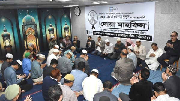 প্রেস বিজ্ঞপ্তি: বাংলাদেশের তৈরী পোশাক শিল্পের অগ্রদূত বিজিএমইএ’র সাবেক সভাপতি, সুয়েটার্স শিল্পের পথিকৃৎ, ড্রাগন গ্রুপ ও রূপালী ইন্সুরেন্স-এর সাবেক চেয়ারম্যান এবং সোনালী লাইফ ইন্সুরেন্স-এর প্রতিষ্ঠাতা ও সাবেক চেয়ারম্যান মরহুম মোস্তফা গোলাম কুদ্দুস-এর স্মরণ করে তাঁর রূহের মাগফেরাত কামনায় আজ রবিবার(২৫ জানুয়ারী) বাদ মাগরিব বিজিএমইএ চট্টগ্রাম আঞ্চলিক কার্যালয়ে দোয়া মাহফিলের আয়োজন করা হয়।