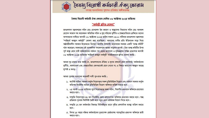 The 5-point demand of the employees is immediate cancellation of all contractual appointments made by the fascist Hasina government and contractual appointments of some controversial persons by the present government, immediate withdrawal of all secretaries and heads of departments appointed before August 5, and immediate withdrawal of recently appointed 42 controversial Deputy Commissioners. A new deputy commissioner should be appointed by preparing the fitlist again in a transparent process.